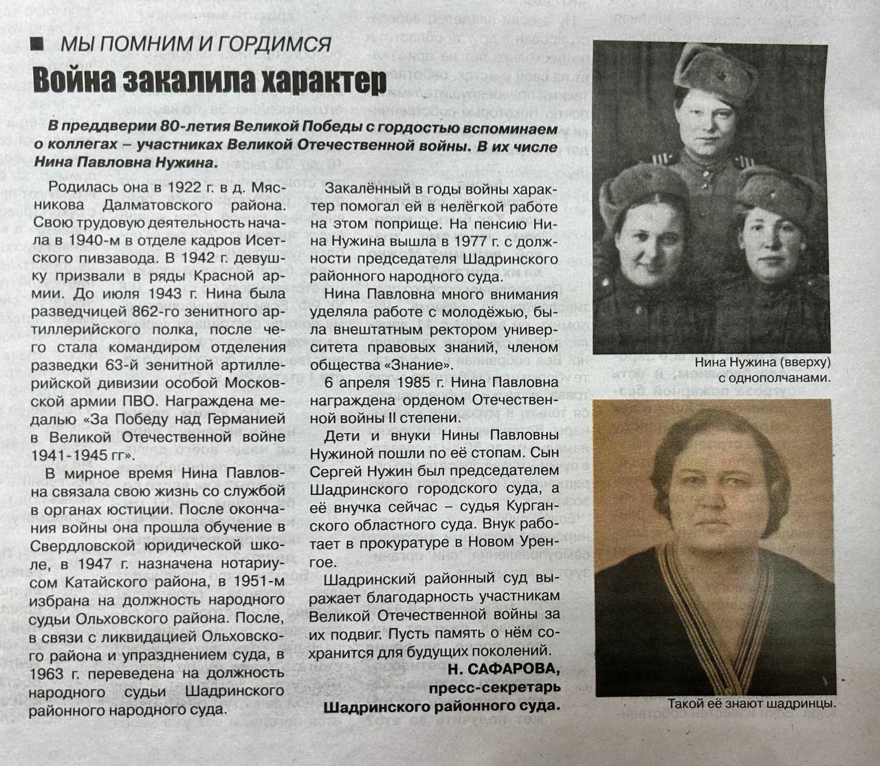 В газете «Шадринский Курьер» №16 от 16 апреля 2025 года опубликована статья «Война закалила характер», посвященная участнику Великой Отечественной войны – Нужиной Н.П.