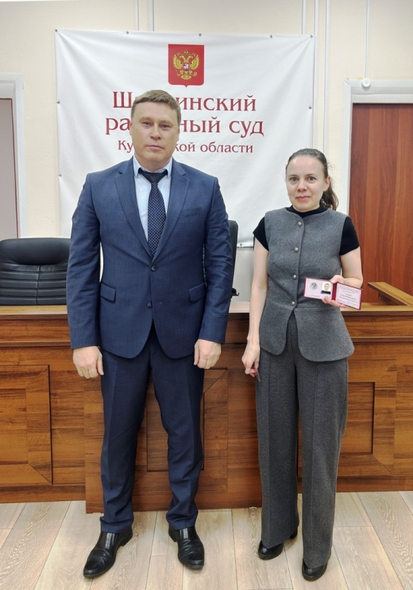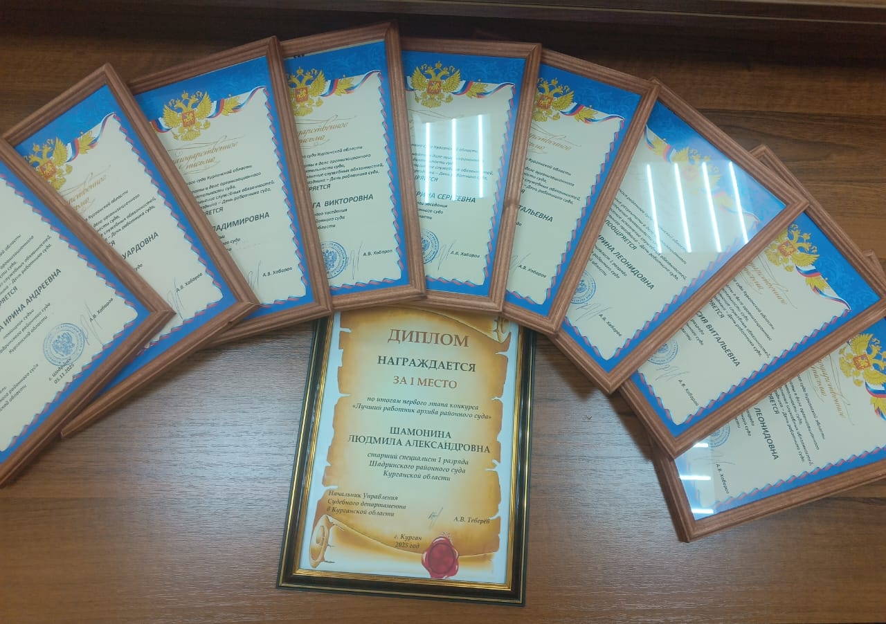 В торжественной обстановке старшему специалисту 1 разряда Шамониной Л.А. вручен диплом за I место по итогам первого этапа конкурса «Лучший работник архива районного суда», мировому судье судебного участка №33 Шадринского судебного района Курганской области Быковой А.В. вручено удостоверение члена Курганского регионального отделения «Российского объединения судей».